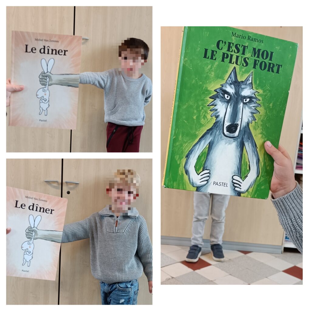« Nous avons utilisé l’appareil photo amené en surprise afin de réaliser des prises de vue donnant l’illusion que le réel s’intègre dans la 1ere de couverture des albums de littérature de jeunesse : « C’est moi le plus fort. » et »Le dîner ». Nous avons dû beaucoup manipuler et bien observer les 1ere de couverture des albums. »