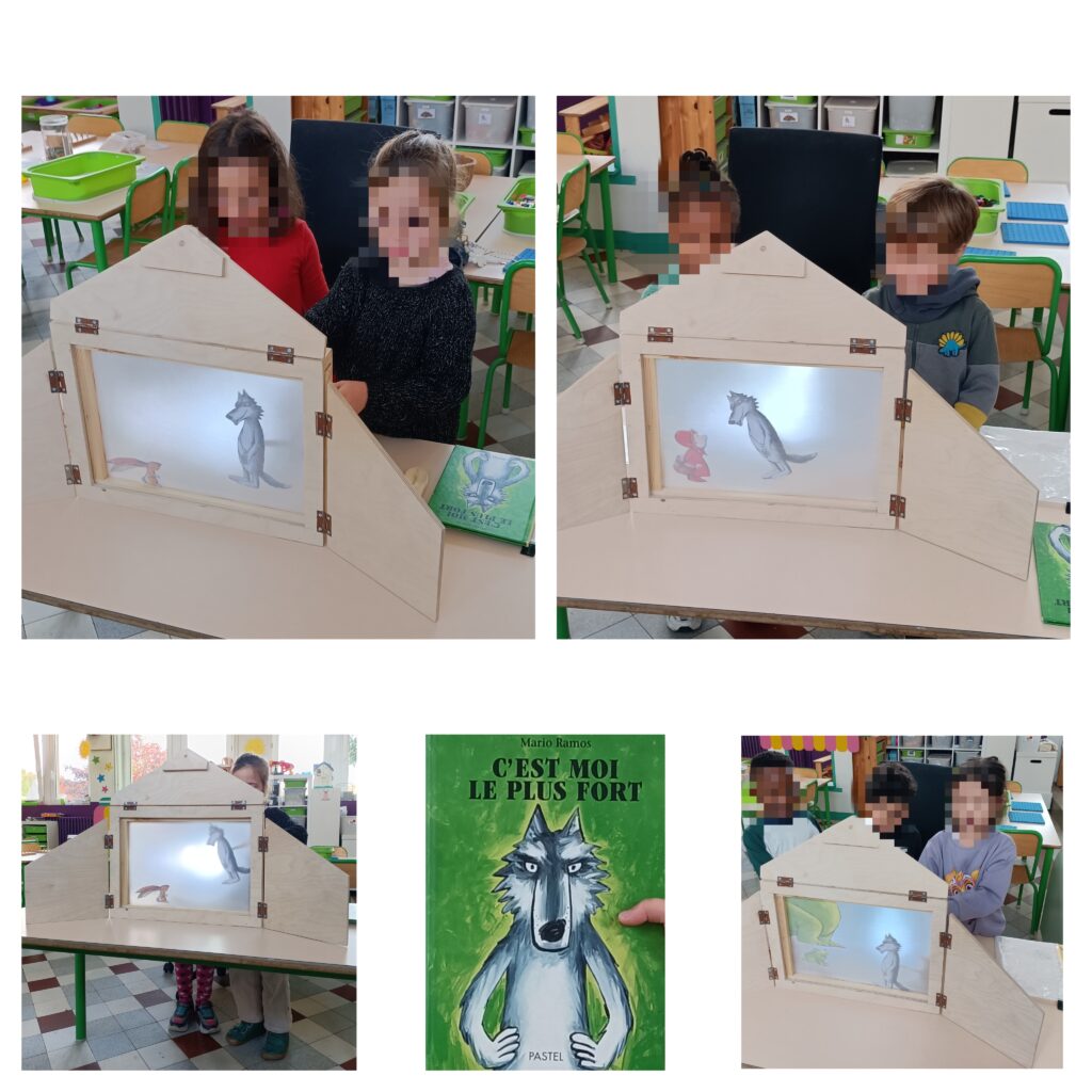 « Les enfants de la 3eme maternelle ont utilisé des marottes, un butaï ainsi que des lampes de poches afin de jouer l’histoire : « C’est moi le plus fort. » sous forme de théâtre lumineux. »