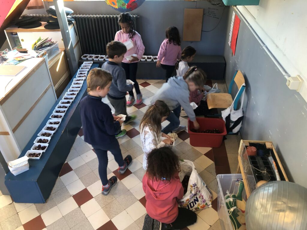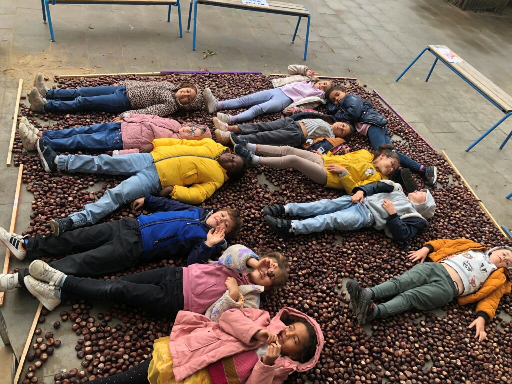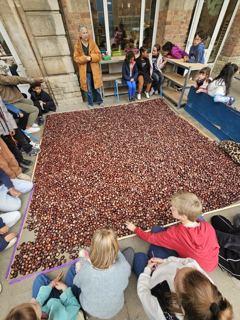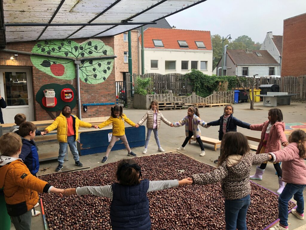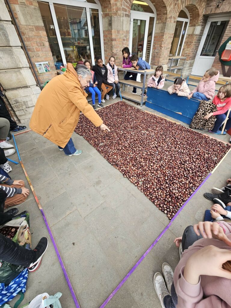 Chaque année, nous organisons le concours de marrons pour les élèves de 1ère et 2ème années. Ce concours permet aux élèves de travailler le comptage tout en s’amusant : ils doivent compter et rassembler leurs marrons pour participer au défi. Mais le concours ne s’arrête pas là ! Une fois les marrons réunis, nous formons un tapis de marrons qui devient un véritable outil pédagogique. Les élèves de 3ème et 4ème années utilisent ce tapis pour travailler les mesures : longueur, largeur, et surface. Les élèves de 5ème et 6ème années, quant à eux, explorent le volume.