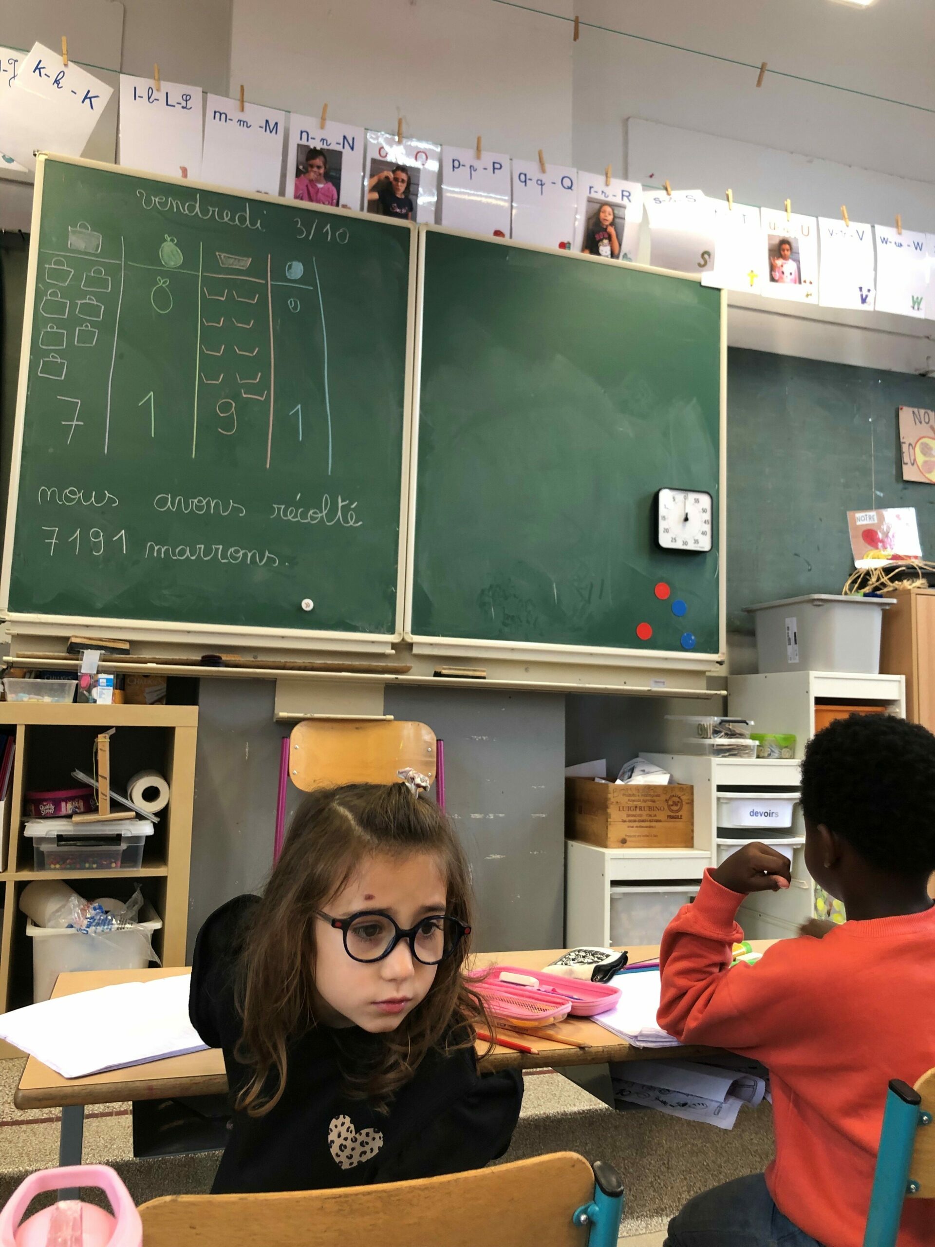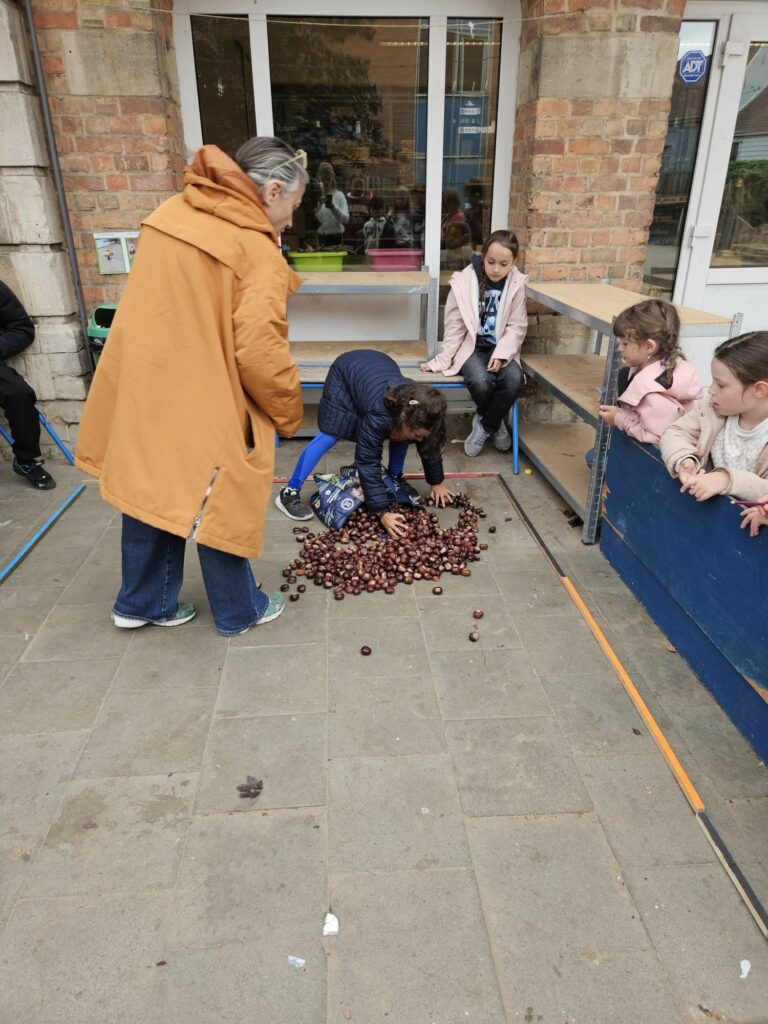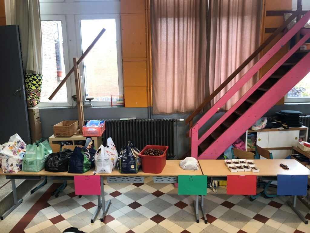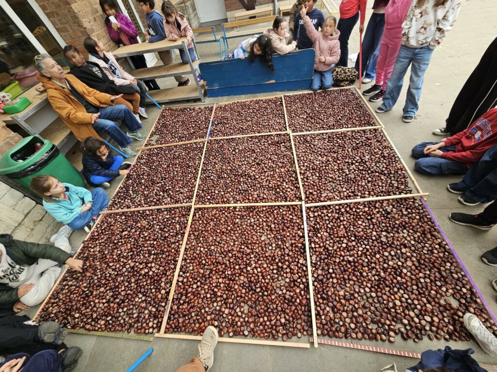 Chaque année, nous organisons le concours de marrons pour les élèves de 1ère et 2ème années. Ce concours permet aux élèves de travailler le comptage tout en s’amusant : ils doivent compter et rassembler leurs marrons pour participer au défi. Mais le concours ne s’arrête pas là ! Une fois les marrons réunis, nous formons un tapis de marrons qui devient un véritable outil pédagogique. Les élèves de 3ème et 4ème années utilisent ce tapis pour travailler les mesures : longueur, largeur, et surface. Les élèves de 5ème et 6ème années, quant à eux, explorent le volume.
